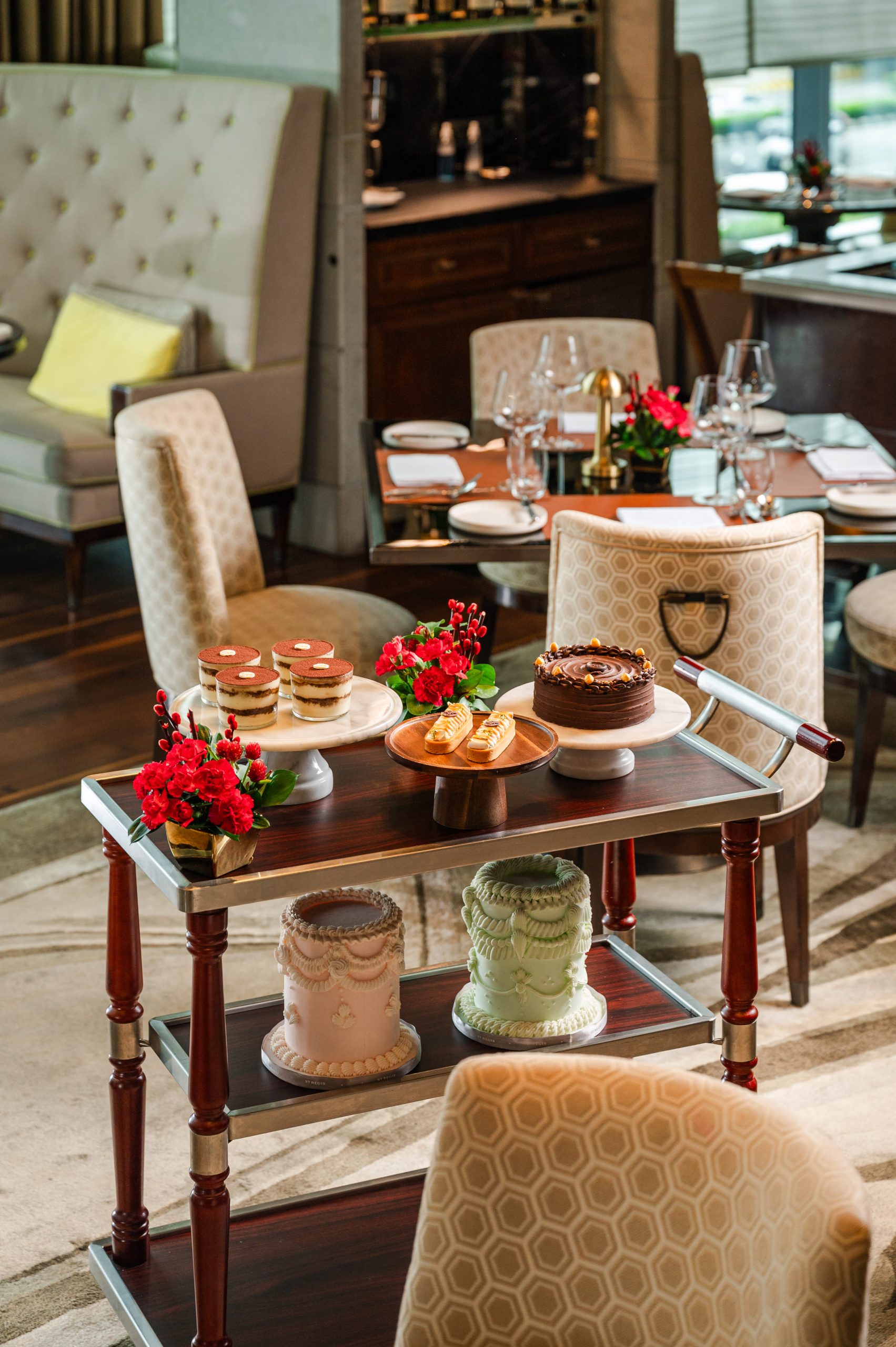 For those seeking to elevate their experience further, the wine wagon rolls through the room with curated Chardonnays, thoughtfully selected to complement the briny sweetness of the sea’s bounty. To conclude the evening, The Brasserie’s famed dessert trolley weaves between tables, presenting a decadent trio of tiramisu, lemon meringue tart, and chocolate fudge cake for a sweet and stylish finale.