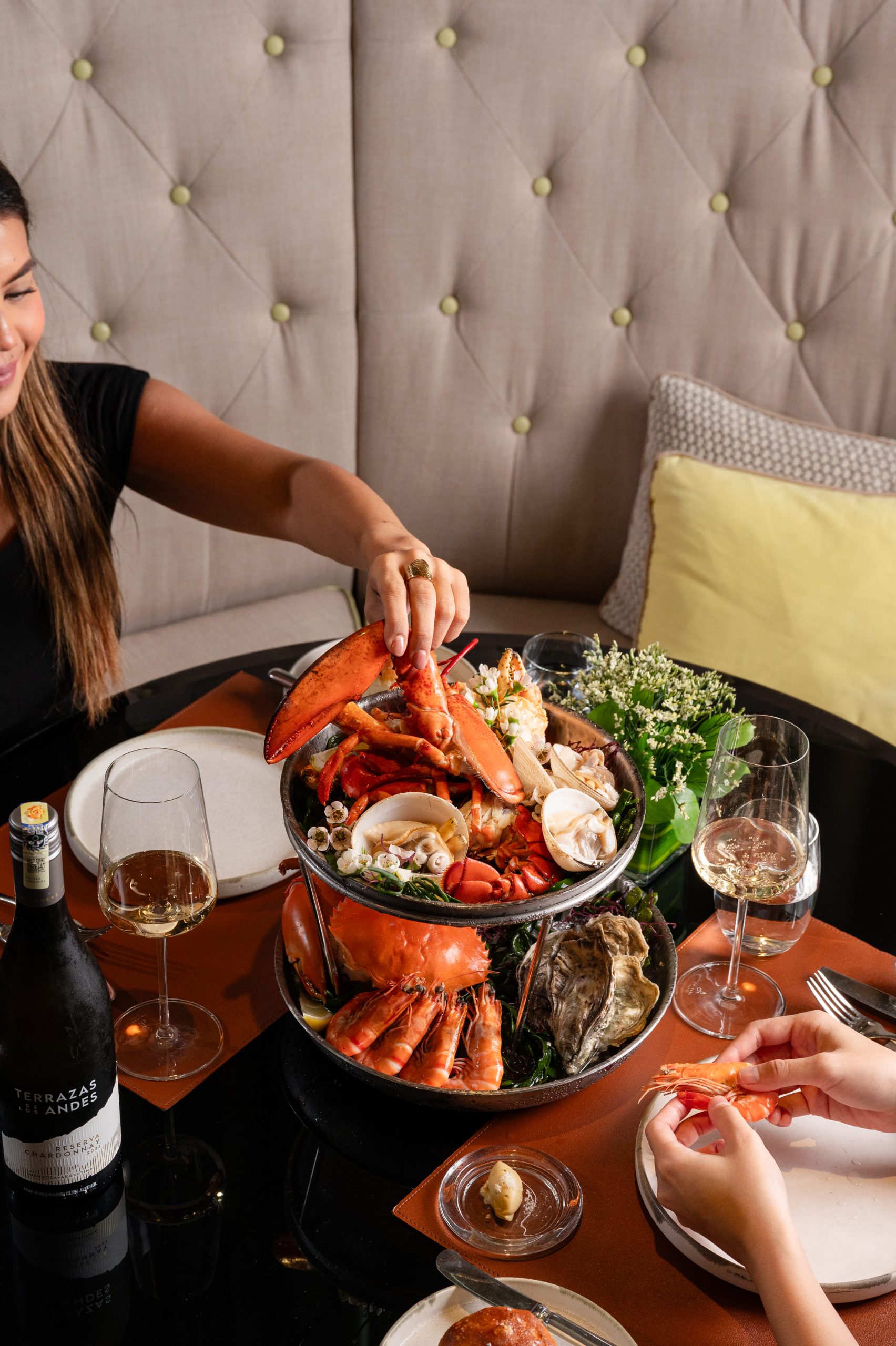 The evening opens with a signature welcome where guests are greeted with warm focaccia and “Le Beurre Bordier” brown butter, personalised with a tableside infusion and a surprising crunch of crispy chicken skin. A delicate amuse-bouche of scallop tartare with Oscietra caviar sets the tone, ushering in a procession of indulgence that continues to crescendo. At the heart of the experience is the signature Seafood Tower — a dazzling display of Boston Lobster, Alaskan King Crab, Oysters, Tiger Prawns, Pearl Clams and Mud Crab, served with artisanal sauces. Guests are encouraged to forgo cutlery and enjoy the feast with their hands, echoing the joy and conviviality of a true coastal gathering.
