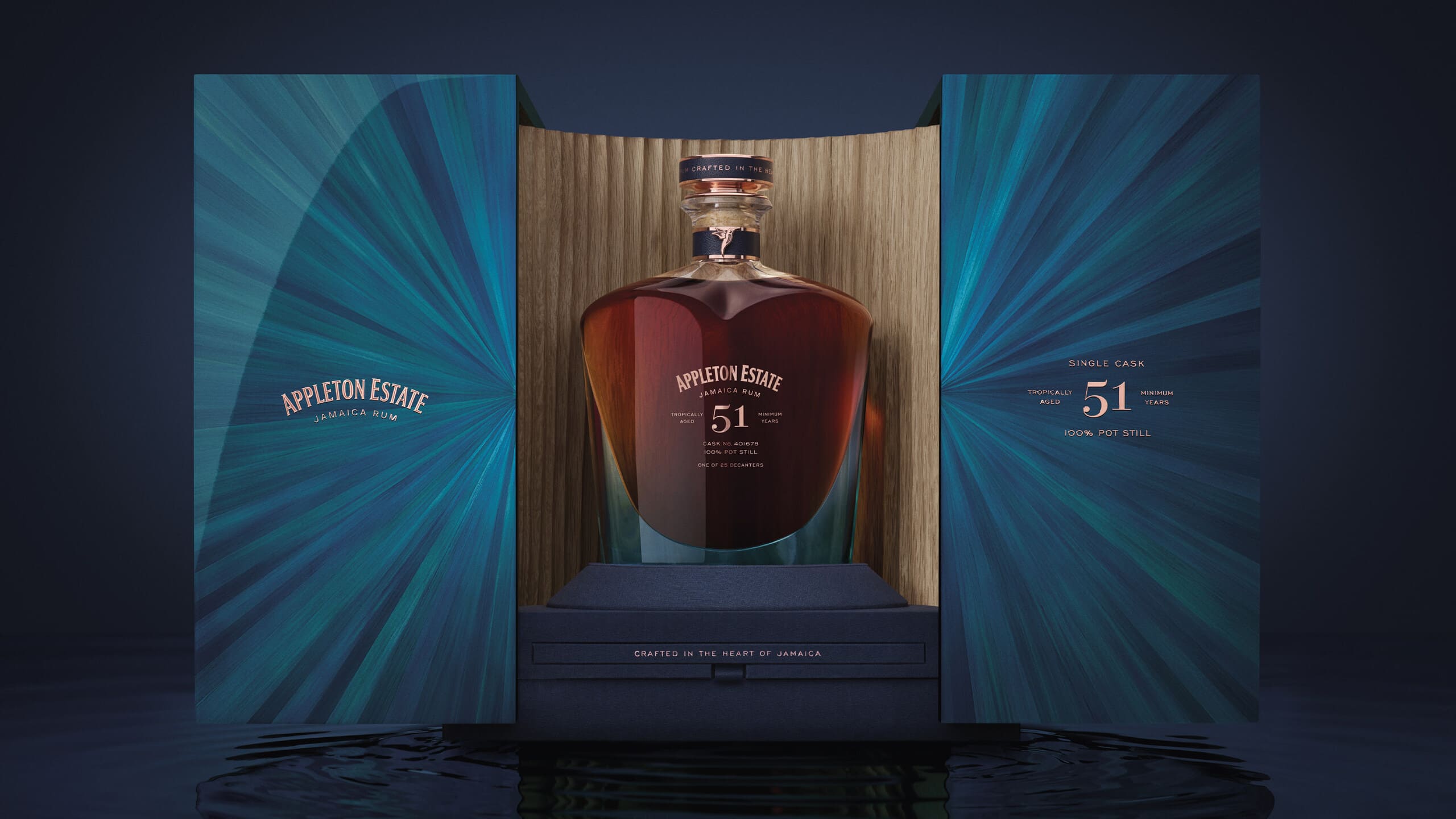 Each of the 25 exquisite decanters pays homage to Jamaican excellence and Appleton Estate’s 275-year legacy. The heart-shaped decanters showcase the rum’s rich mahogany colour, transitioning into a crystalline aquamarine base that reflects the purity of the limestone spring. The decanter is crowned with a handcrafted copper rendition of Jamaica’s national bird, the Doctor Bird, set against a navy backdrop. It is housed in a striking turquoise case adorned with a radial straw marquetry pattern inspired by pressed cane.