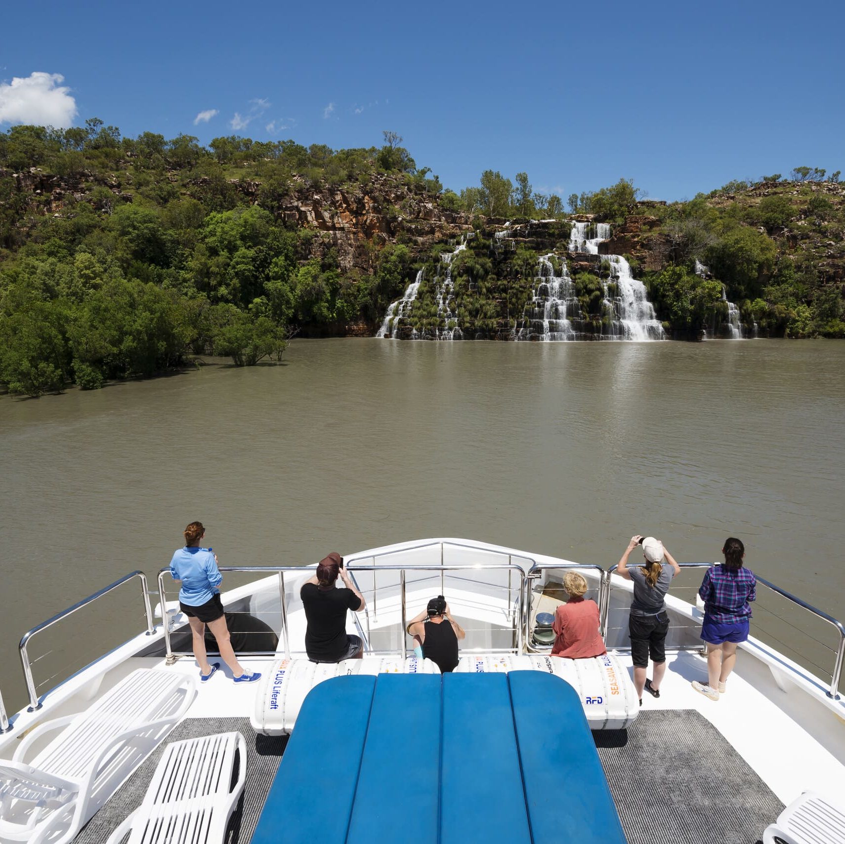 The most popular way to experience the falls is on a seaplane or helicopter tour, where the bird’s-eye view reveals the sheer force and beauty of the rushing turquoise water against rugged red cliffs. Visitors can also visit Talbot Bay on a guided boat cruise to observe the powerful splendour of the falls and to experience this sacred place.