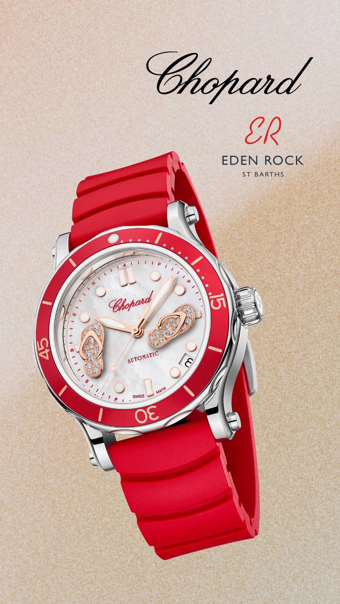 The Happy Ocean timepiece is taking up winter residence in the Caribbean sunshine with a brand-new edition available exclusively at the Eden Rock – St Barths hotel. Framed by a 40 mm-diameter case in Lucent Steel™ and/or ethical 18-carat rose gold gracing three limited series, a textured mother-of-pearl dial welcomes the joyful dance of charms that are more daring than ever: a pair of gold and diamond flip-flops.