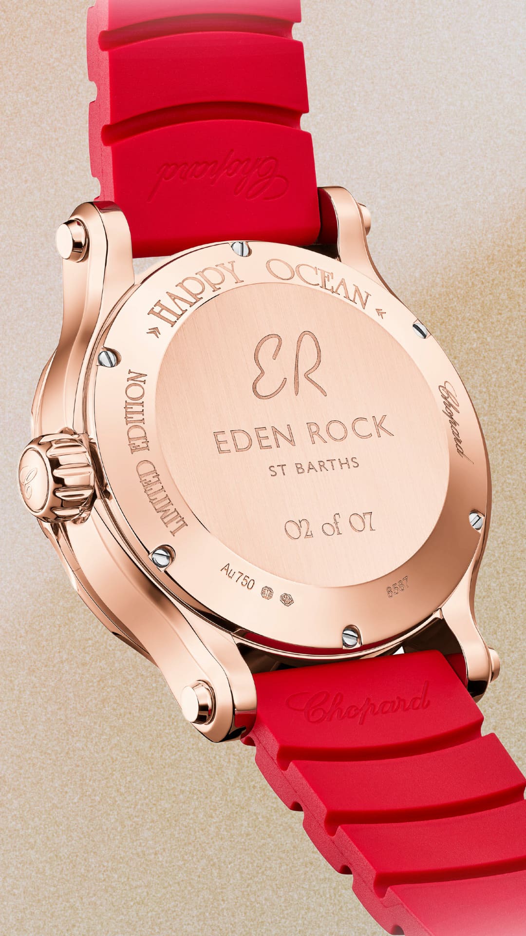 This Happy Ocean model swaps out the traditional dancing diamonds for a daring pair of flipflops in ethical 18-carat rose gold set with diamonds. As carefree as the breath of fresh air that holidays bring, these charming mobiles dance against a white background of textured mother-ofpearl gathered from the heart of shells. Chopard also interprets its dancing flip-flop on a matching pendant in ethical 18-carat rose gold, enabling perfect watch and jewellery pairing. The three limited editions of this already iconic timepiece – 27 in Lucent Steel™; 27 in Lucent Steel™ and ethical 18-carat rose gold; and 7 in ethical 18-carat rose gold – harmoniously pick up the hotel’s style codes through subtle red and white accents on the strap, as well as on the aluminium bezel and the dial’s minutes track.