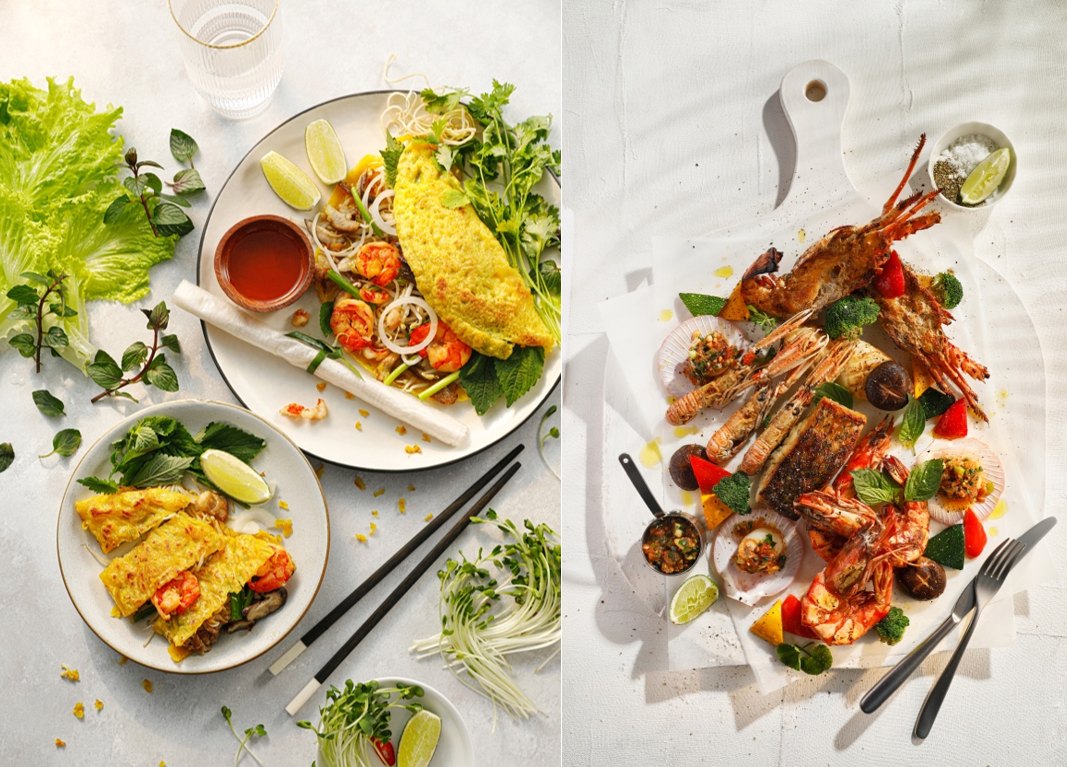 Pictured (left): authentic Vietnamese Banh Xeo pancakes at Citron, and (right) a sumptuous Surf & Turf feast at Barefoot