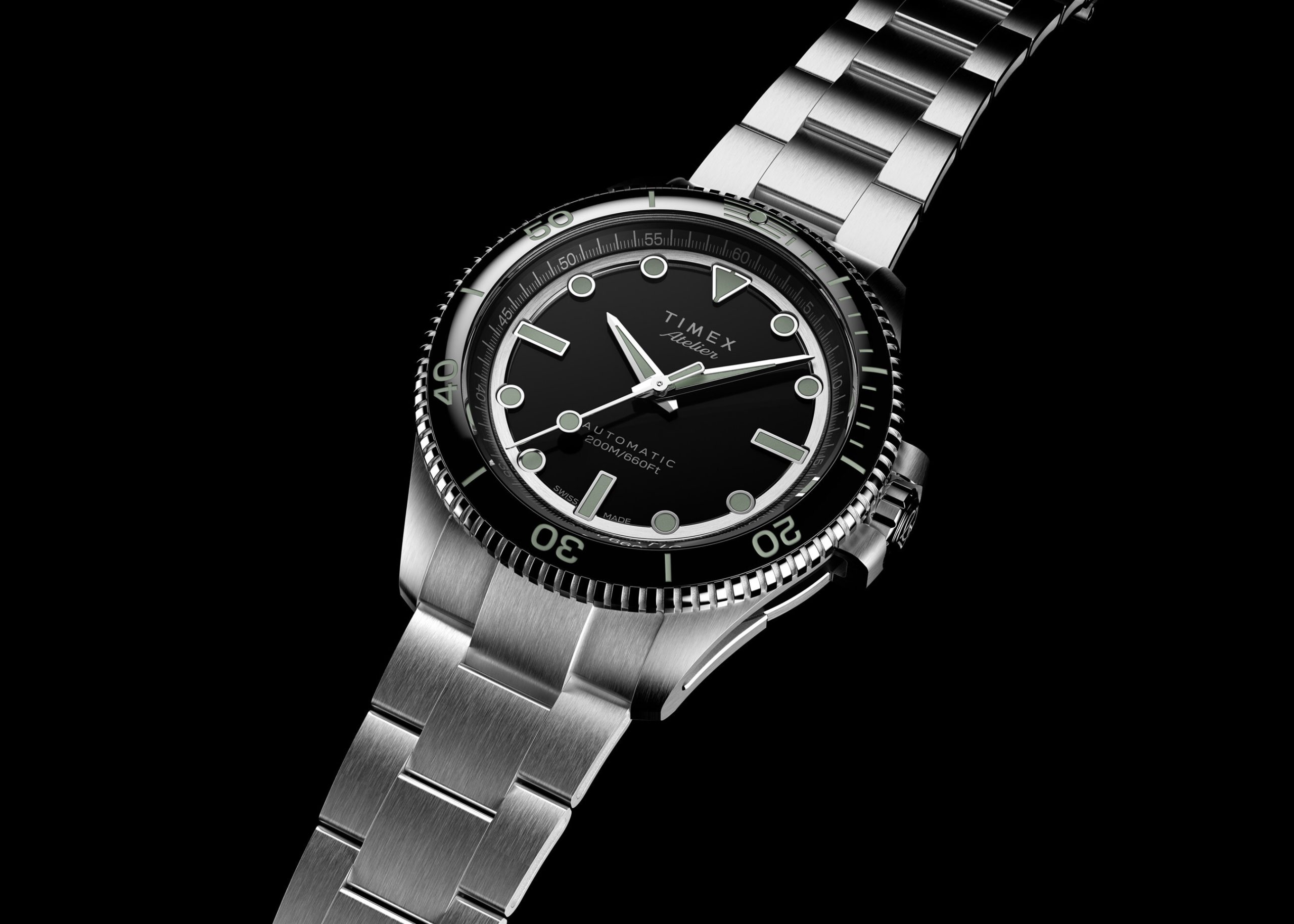 The launch timepiece, the Timex Atelier Marine M1a, embodies this philosophy. Its 41mm stainless-steel case features a skeletonised architecture with a black IP-coated middle case, screw-down crown, and 200M water resistance all framed under a double-curved sapphire crystal treated with triple-layer anti-reflective coating. A unidirectional rotating bezel is fitted with a black ceramic insert, Swiss Luminova, and elapsed time index. Beneath it, a polished black enamel dial reveals silver-applied indices and hands filled with Swiss Luminova for clarity at all hours.