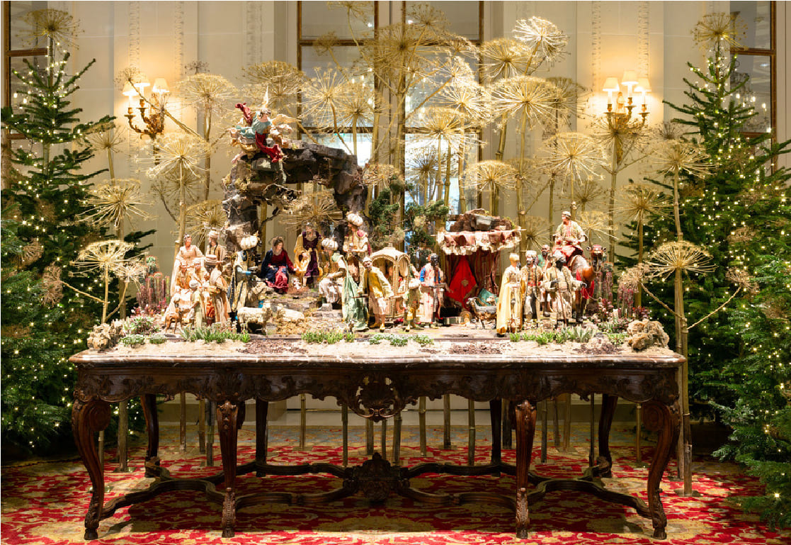 For the end-of-year festivities, Le Bristol Paris adorns itself with its most beautiful lights, illuminating the hotel from the facade to the Jardin Français with sparkling reflections. The centerpiece of this enchanted season is the nativity scene, a fairy-tale installation that transports our guests to the warm and magical atmosphere of 18th-century Naples. Our Parisian Palace has once again engaged the exceptional talent of Ulderico Pinfildi, an acclaimed artisan renowned for his delicate handcrafted interpretation of the Neapolitan nativity.