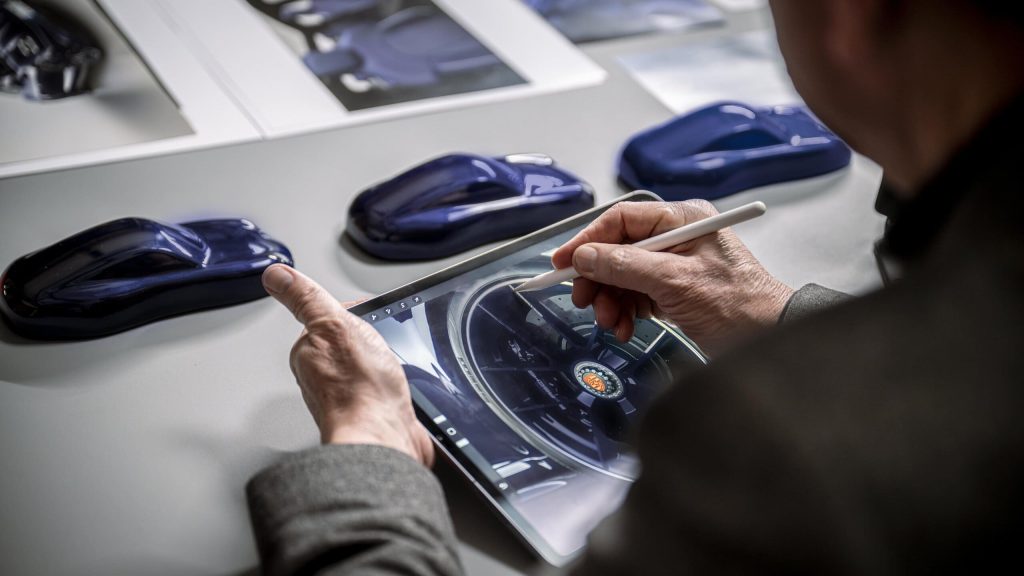 The wheels have been painted in Blusogno and finished with white, hand-painted pinstripes. The wheel hub cover also bears the exclusive blue colour, which forms a striking contrast to the red Porsche crest. At the rear, the model lettering is painted by hand in white and outlined in Blusogno, which gives the overall design an almost noble, harmonious touch.