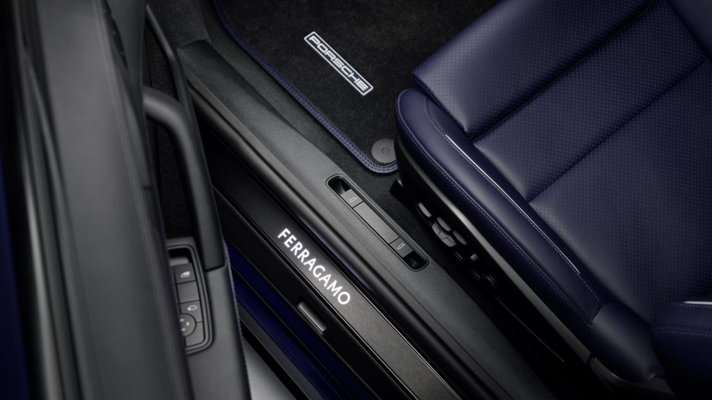 The sides of the vehicle key are painted in Blusogno. The edition also includes a custom-made indoor car cover in the same colour with white piping, a coloured Porsche crest on the front, and white Ferragamo lettering on the sides.