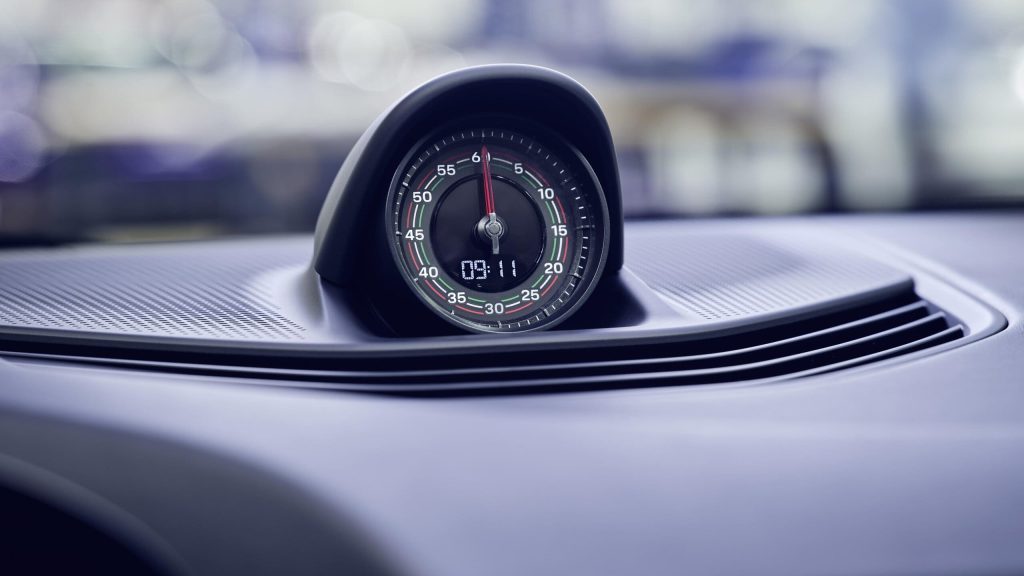 Blusogno also features heavily inside the car. Leather and yarn were developed and produced especially for the project in this special colour. The front and rear seats, the GT sports steering wheel and details on the centre console are upholstered in Blusogno leather. Modern Pebble Grey piping on the seats and the corresponding 12 o’clock marking on the GT sports steering wheel pick up on the bright accents of the exterior. The car’s document folder and key pouch are also made of Blusogno leather. In the 911, the gear lever is covered with Blusogno leather on the sides. Red trim strips on the storage compartments and in the trunk provide a contrast.