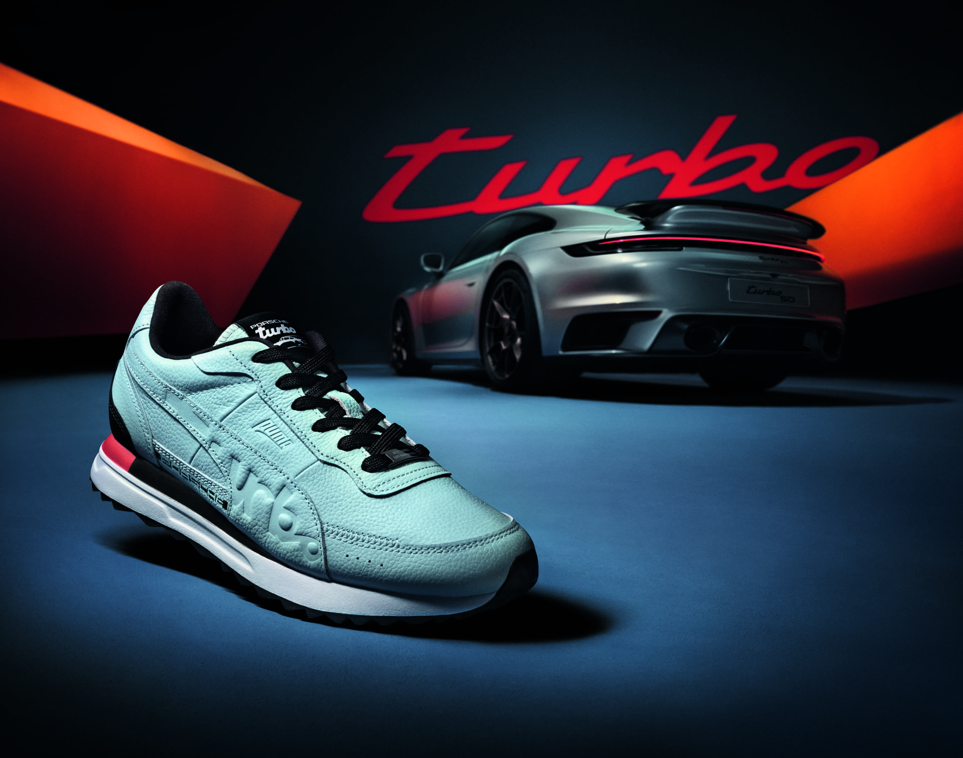 Dynamic vintage turbo lettering on the outside and a subtle Porsche logo are the key elements of all versions. Sneaker fans will particularly enjoy the heel section, which picks up on the characteristic “whale fin” of the rear spoiler and the vehicle’s horizontal red tail lights. The heel features a tonal Porsche Crest in 3D print. The front of the lacing is adorned with a removable plaque with 50th anniversary lettering. The brand-new motorsport-inspired Puma “Road Rider” sneaker silhouette was chosen for all models.