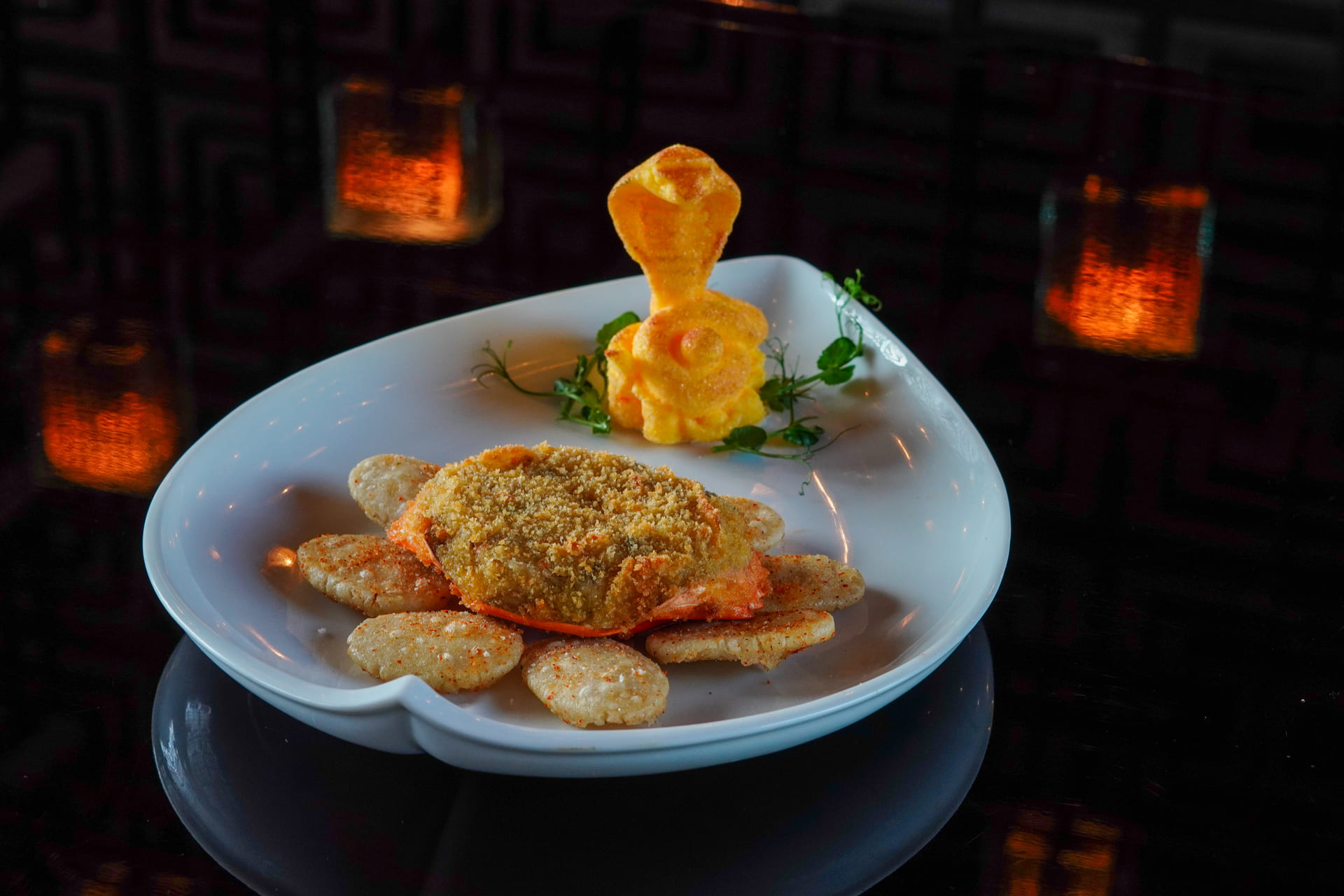 Sovor the exquisit Salmon Yee Sang and Fried Crab with Rice Cake, Onion, and Ginger