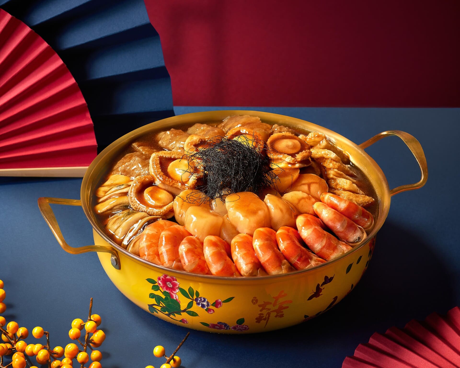 Indulge in the rich flavors of Prosperity Treasure Pot and Homemade Cured Salmon Yee Sang.