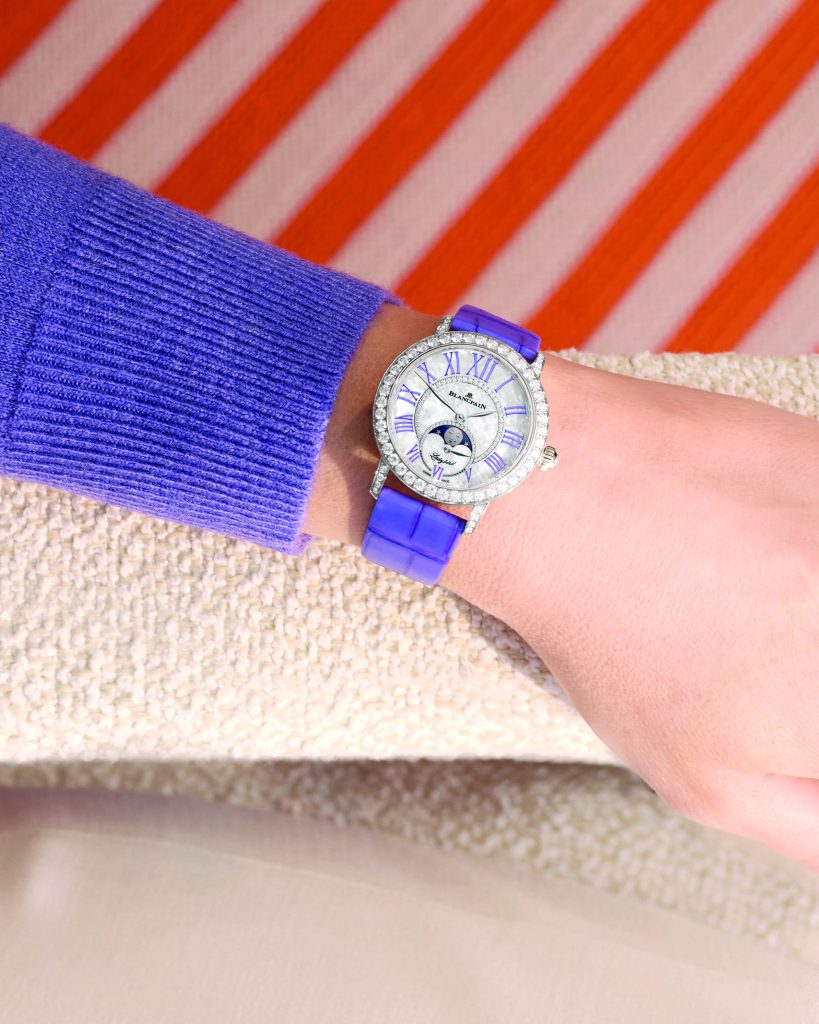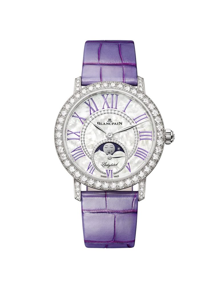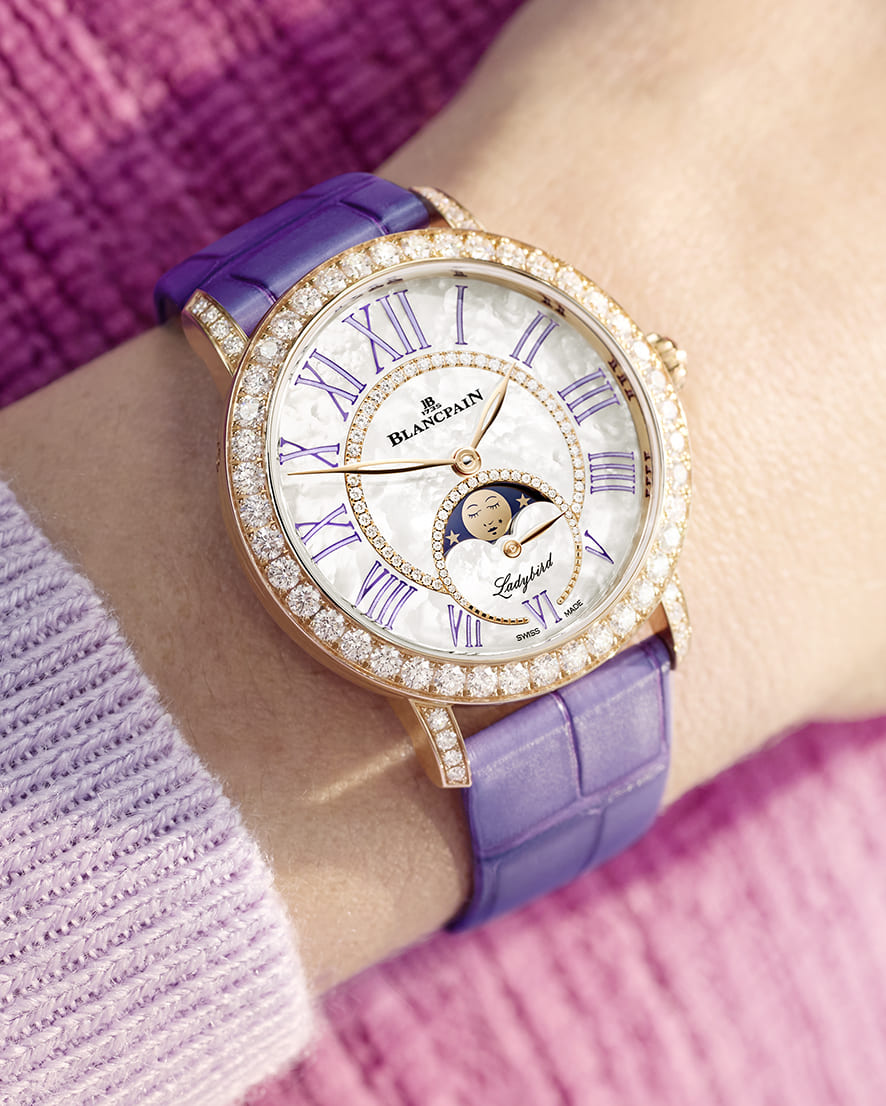 The royal purple shade makes its debut in the Ladybird Colors collection, joining an already vibrant palette of raspberry pink, lilac, midnight blue, coral blue, apple green, peacock green, forest green, turquoise, lemon sorbet yellow and white. With the Ladybird Colors Royal Purple capsule collection, Blancpain merges watchmaking and jewellery inspiration, capturing the spirit of sunny days. A staple of current trends, the purple hue captivates with its sophisticated contrasts and elegantly harmonises with the iridescent softness of the unique mother-of-pearl called nacre perlée.