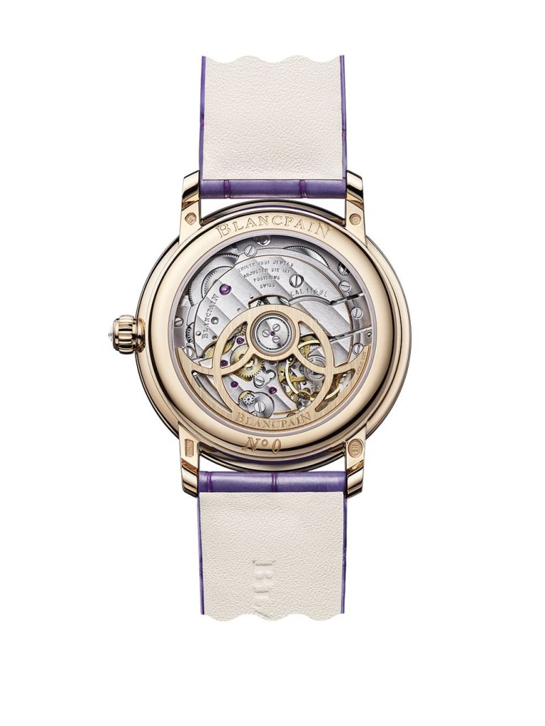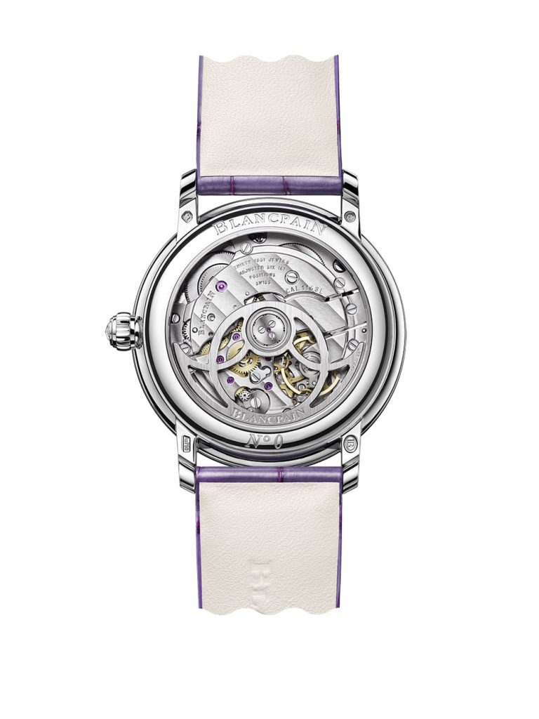 Twelve inclined Roman numerals in royal purple, applied directly to the mother-of-pearl, encircle two circles of 70 diamonds that interlock. A Blancpain signature, the openwork sage leaf-shaped hands indicate the hours and minutes.
