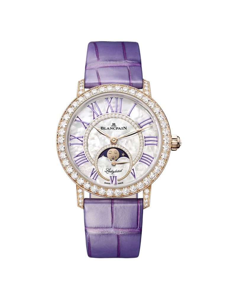 The new royal purple hue for the Ladybird Colors features royal purple indexes and a matching alligator leather strap. The dial is made of nacre perlée, considered the rarest form of mother-of-pearl used in watchmaking—difficult to extract and even more delicate to work with. It includes over 2 carats of diamonds and comes in an 18 ct red or white gold case. The watch is powered by an automatic movement with a 4-day power reserve, reflecting Blancpain’s feminine watchmaking heritage since the 1930s.