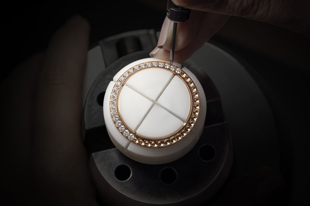 Vibrant and textured, the nacre perlée dial is at the heart of this new Ladybird Colors creation. Of exceptional quality, this mother-of-pearl is only found in limited quantities and is meticulously extracted from specific cultured shells, each of which can make just one, or at most, two dials. Carved from the centre of the shell’s most curved area, it rarely allows usable nacre perlée diameters greater than 28 mm to be obtained, and it represents less than 2% of all usable mother-of-pearl of a shell, the rest being destined for less selective uses.