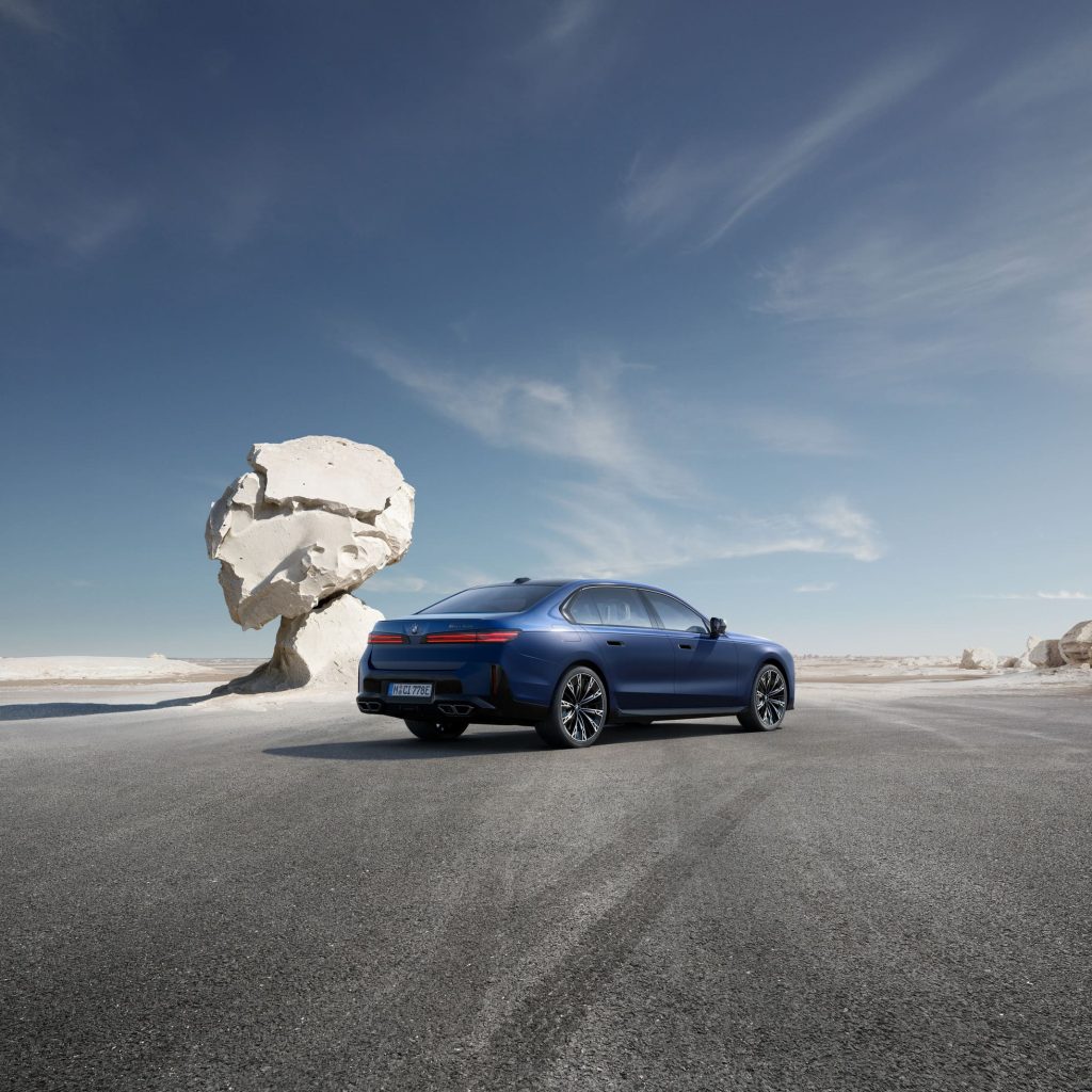 The new BMW 7 Series embodies the specific interpretation of the new BMW design language for the luxury segment. A monolithic exterior, the new BMW kidney Iconic Glow and minimalist crystal headlights give the car a visually impactful presence and make it easily recognisable. The side view impresses with reduced surfaces, a character line and classy details, while the rear end is shaped by newly designed lights and clear forms. Three BMW M Performance models provide sporting differentiation to striking effect, with the M Sport package and M Sport package Pro bringing further emphasis. BMW Individual offers a broad spread of personalisation options, including BMW Individual Dual-Finish paintwork – a world first marked by technological sophistication and expert craftsmanship. Completing the picture are a carefully curated selection of ex-factory wheels, from 20-inch rims to the new addition of 22-inch items.